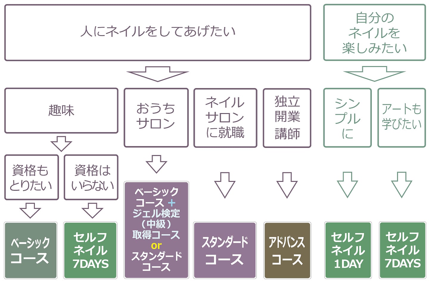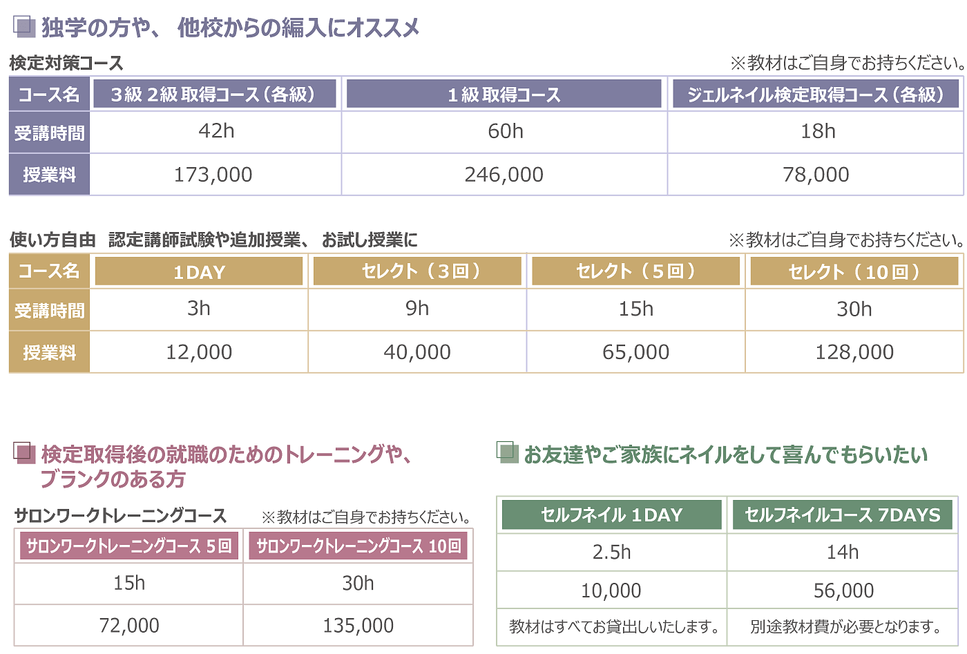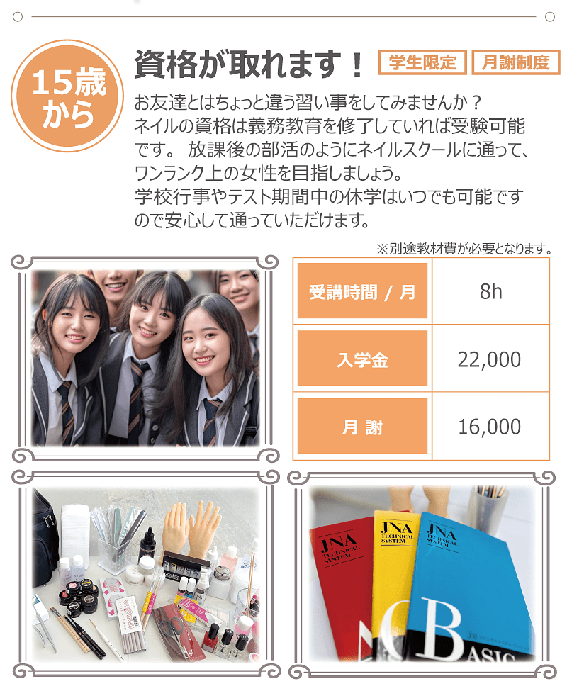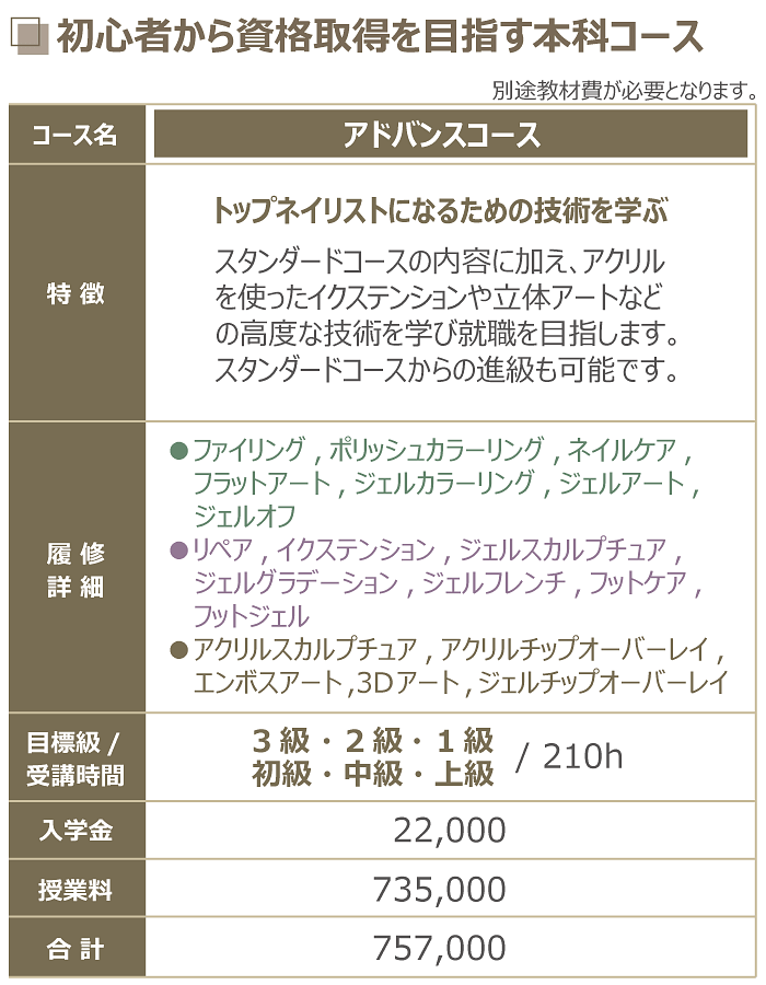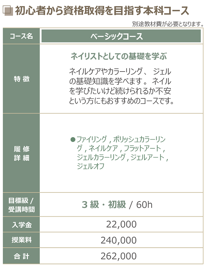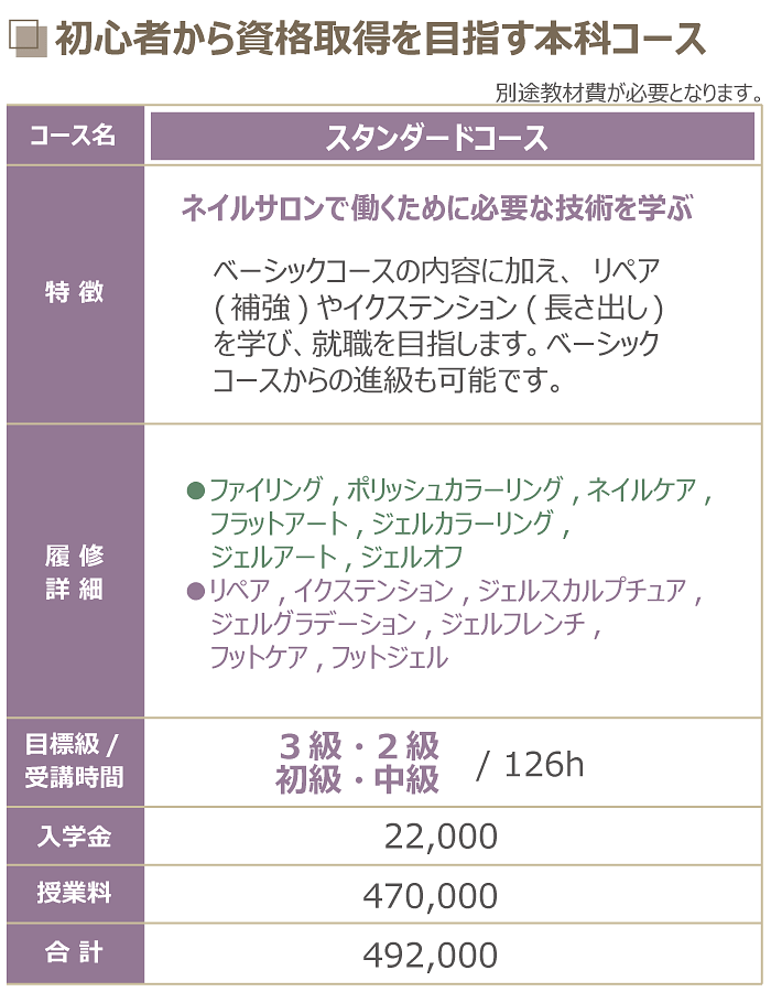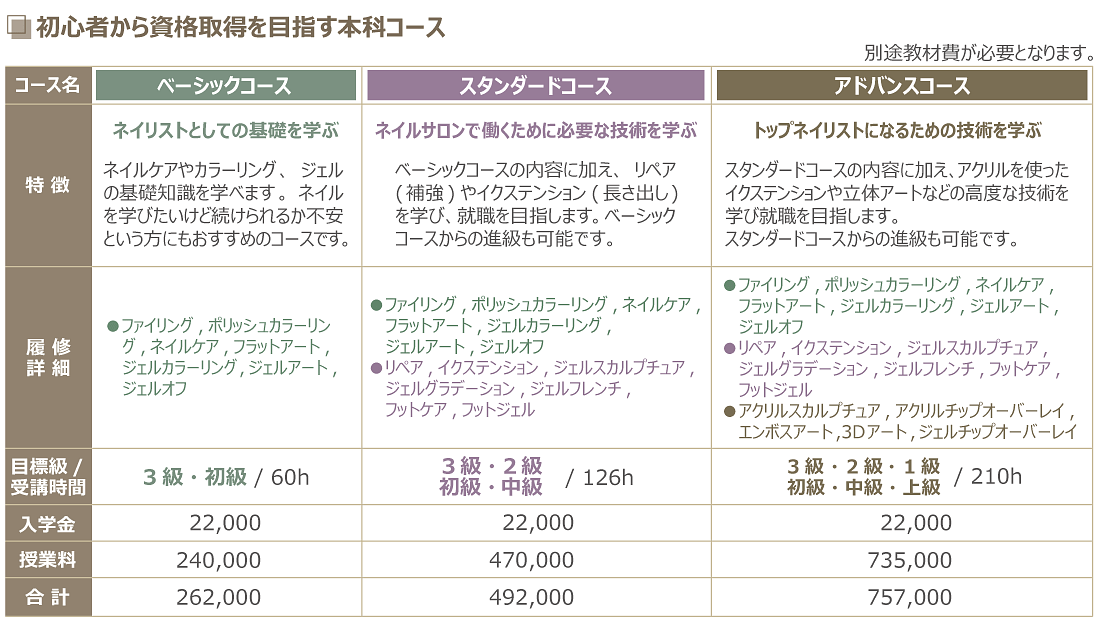 mlineネイルスクールでは、「ベーシック」「スタンダード」「アドバンス」「エキスパート」の本科各コースのすべてで、資格取得に向けた万全のバックアップ体制をとっていますので安心です。